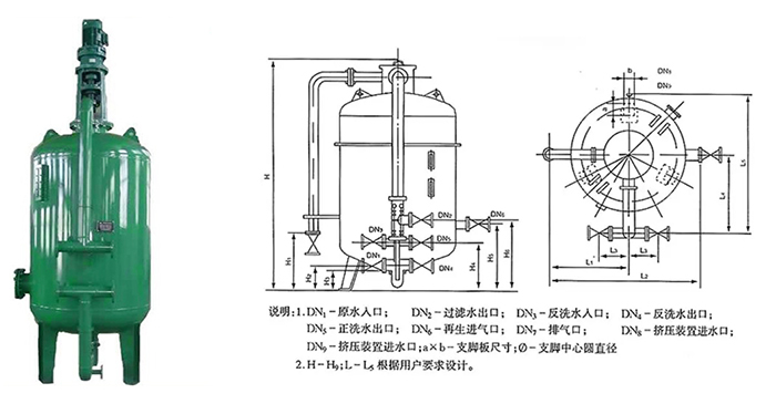 結(jié)構(gòu)簡(jiǎn)單:主要由以下部分構(gòu)成:配套管線和閥門(mén),其中過(guò)濾器體又包括:筒體、反洗氣管、布水組件、支撐組件、濾料、排氣閥(外置)等