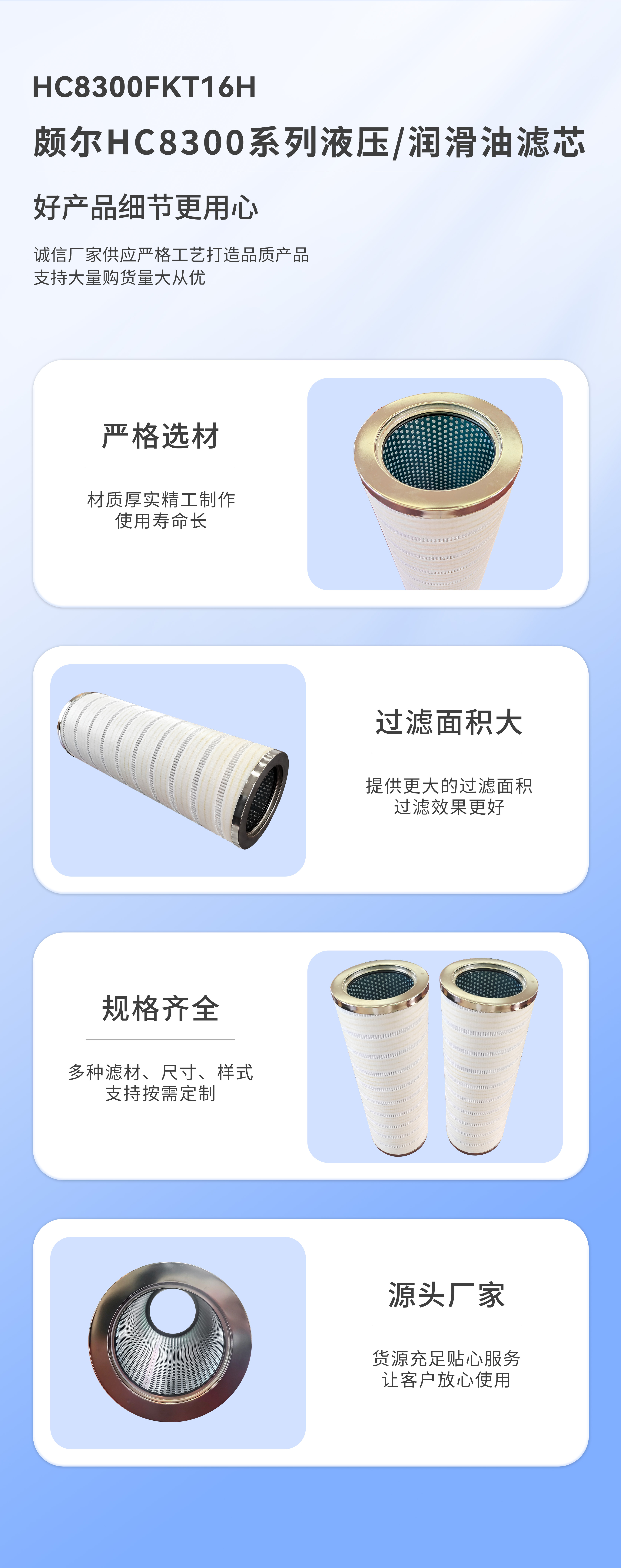 【產(chǎn)品簡(jiǎn)介】: 頗爾濾芯HC8300系列用于液壓、潤(rùn)滑系統(tǒng)的壓油過(guò)濾,用以濾除系統(tǒng)中污染物,系統(tǒng)的正常運(yùn)行,公司生產(chǎn)的濾芯采用的是進(jìn)口濾材,具有的技術(shù)含量,納污除塵的性能較強(qiáng),完全可以替代進(jìn)口的濾芯使用。